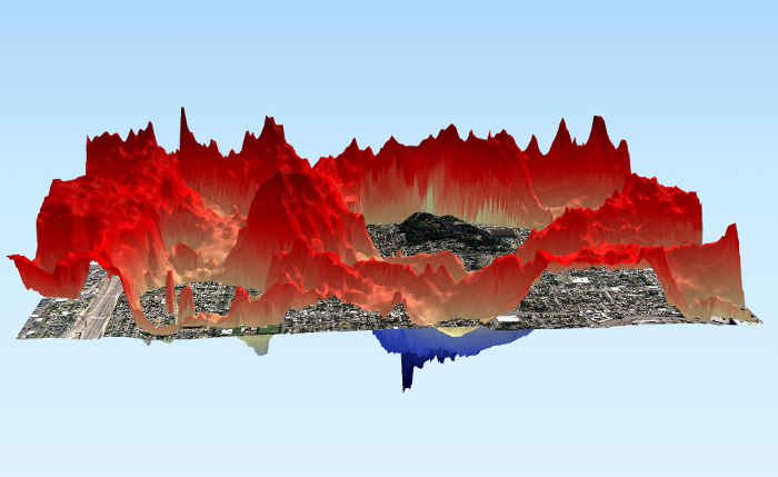 An interactive 3D model of the urban heat island effect over Mount Tabor, Portland, Oregon. Warning: May take a while to load on slow internet connections!