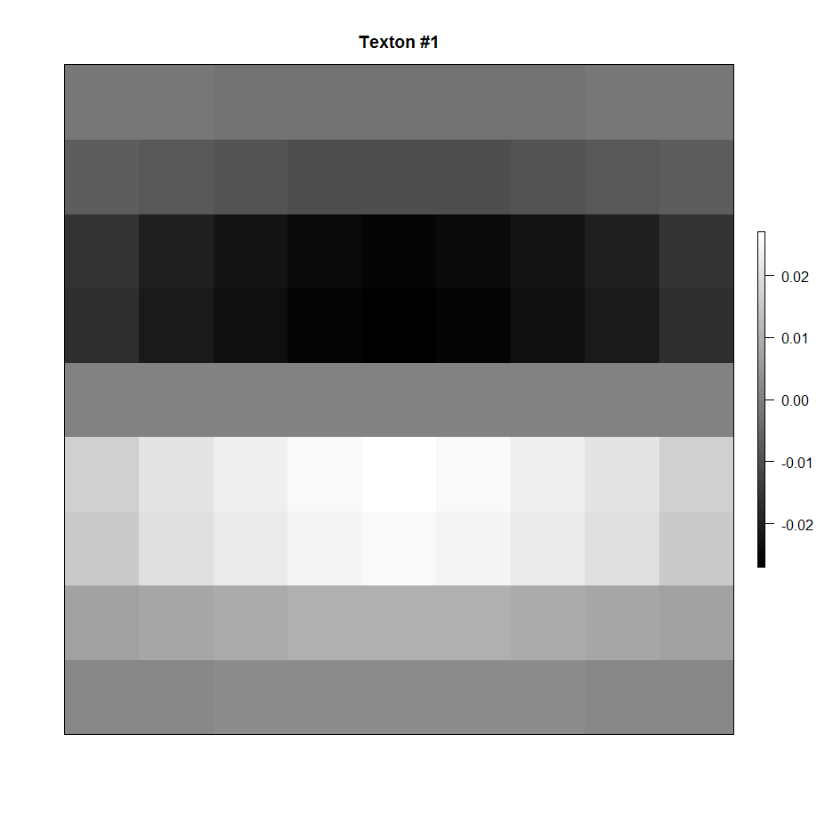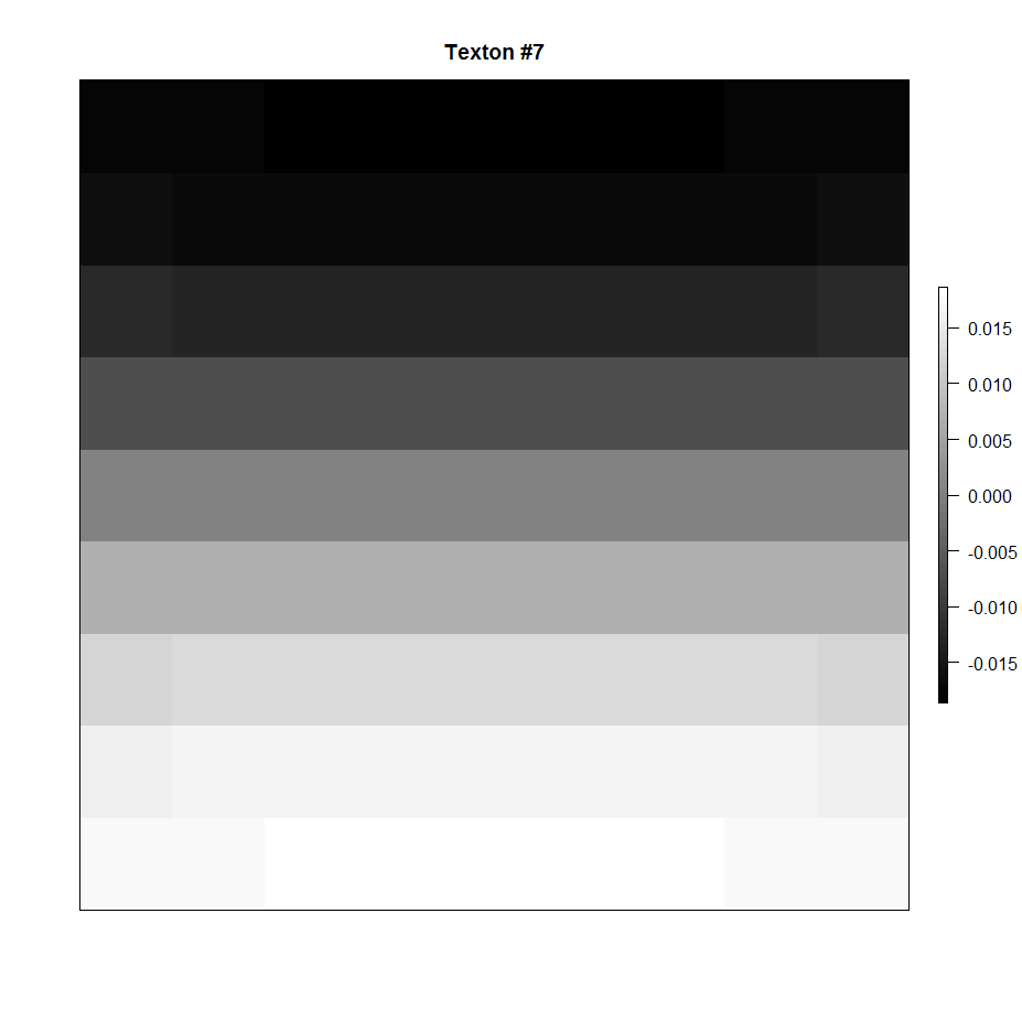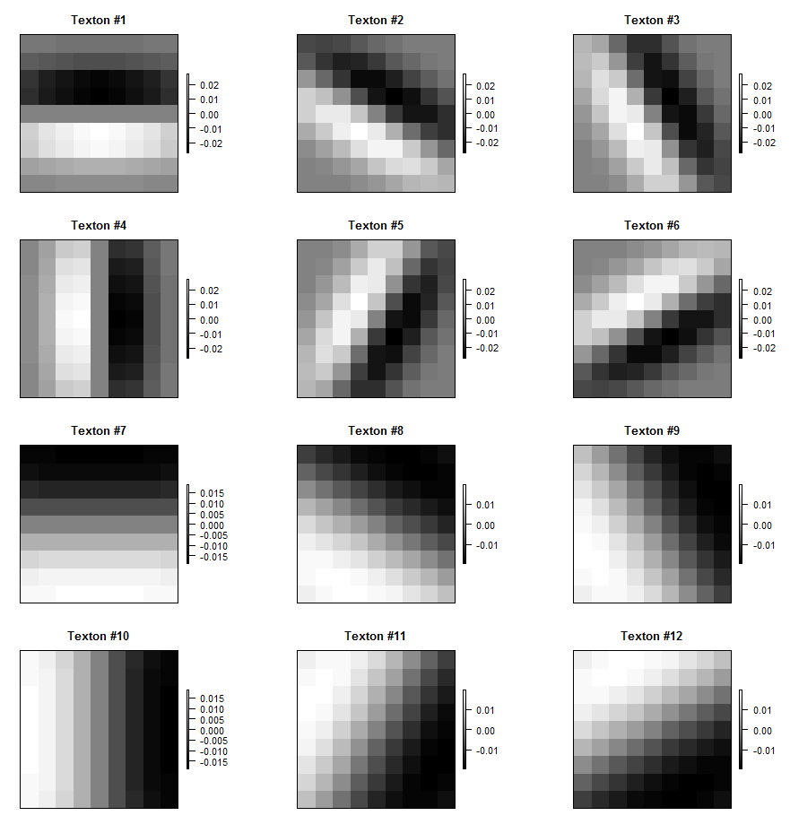 However, texton filters are slightly more complex. Here they are represented as rasters (for visualization purposes). All 12 filters are used in the analysis.